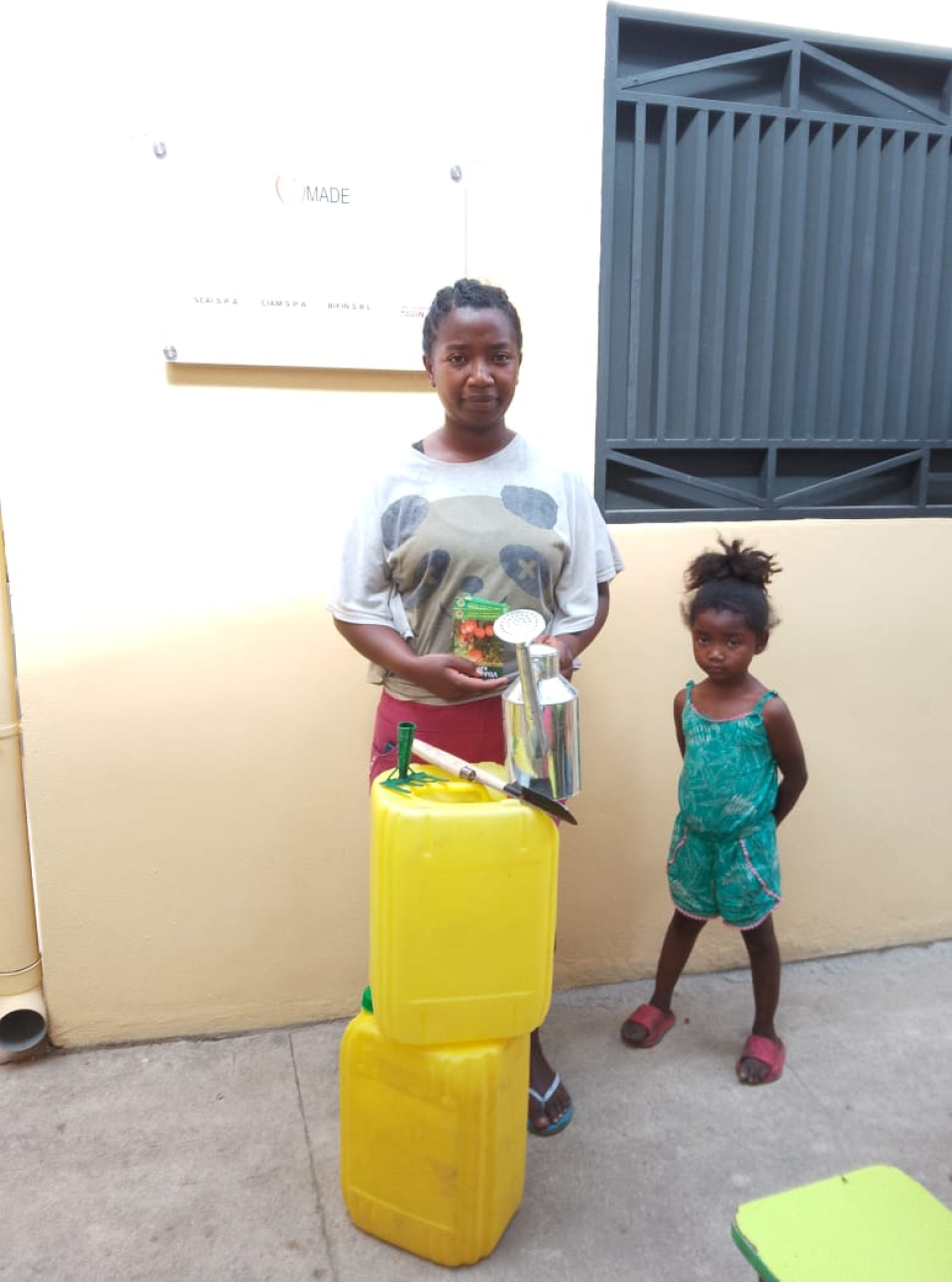 Pour renforcer l’impact des sensibilisations, chaque famille a reçu un kit complet d’agriculture urbaine comprenant : deux bidons jaunes, un arrosoir, une pelle, un râteau, un couteau et des sachets de semences de légumes.