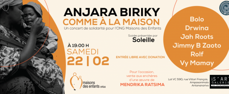 Si la musique de six artistes hyper connus (et avec une générosité retentissante), sur la scène de l’Is'art Galerie (un coin d’exception à Tana (et qui vit ici, le sait bien), et mélangée avec l’art de Mendrika Ratsima n’est pas suffisante pour vous convaincre de participer au concert « Anjara Biriky », alors venez pour connaitre ce que nous les gens de Maisons des Enfants faisons ici à Mada, et pour nous soutenir !!!